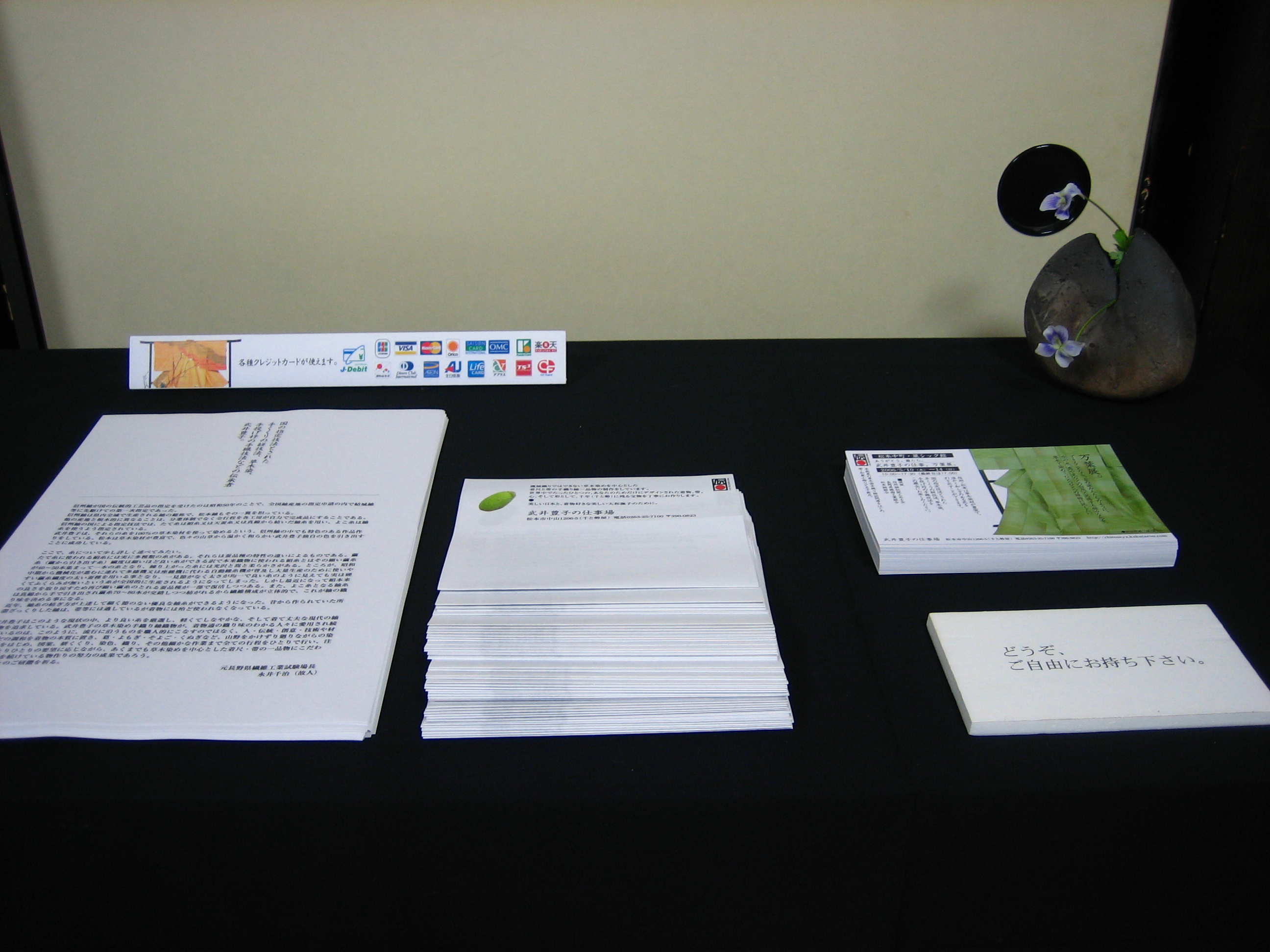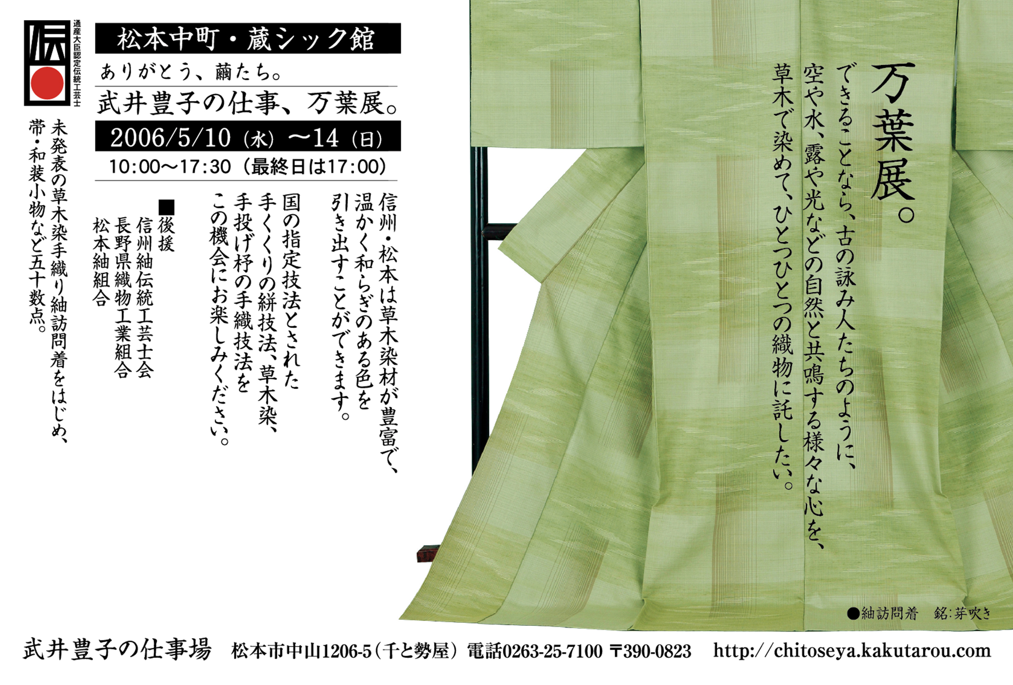 私の物作りは伝統の技法を守りながらも常に現代の人々に好まれる研究をし続けて、はや三十年が過ぎました。そして今、益々紬が面白くなってきています。昨年は三十周年と内閣総理大臣賞受賞記念として東京で個展を開催しましたが、松本でも開催できないものかと各方面の方々よりご意見を頂戴し、今回の開催に至りました。会場では作品のみではなく、染料となる草木やそれによって染められた絹糸、繭(珍しい緑色をした山繭も)も展示し、僅かですが織物制作過程の映像も流します。
